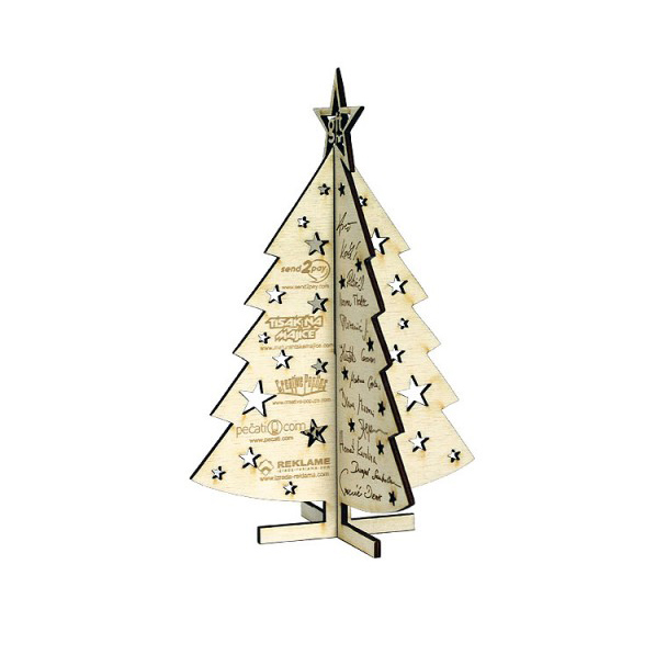 Ova kreativna drvena čestitka u obliku božićnog drvca zapravo je primjer promotivnog poslovnog poklona tvrtke GIT, kojom možete čestitati blagdane svojim poslovnim partnerima i klijentima ili jednostavno promovirati proizvode, usluge i projekte svoje tvrtke. Čestitka je izrađena od drva, a pomoću laserske tehnologije izrezane su zvjezdice i natpis Sretan Božić, dok su potpisi zaposlenika tvrtke i logotipi projekata ugravirani.