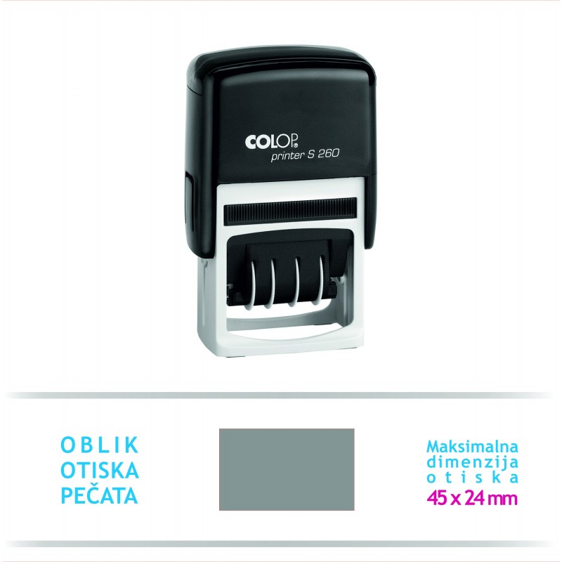 Colop Printer 260 Datumar sa maksimalno 2 reda teksta iznad/ispod datuma. Otiskuje datum u strukturi dan – mjesec – godina. Ovaj mali pouzdani partner služit će Vas u uredu, radionici ili na putu. Godine na datumaru su valjane 12 godina. Omogućava precizan otisak jer ima okvir za pozicioniranje prilikom otiskivanja.