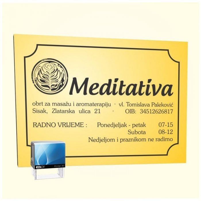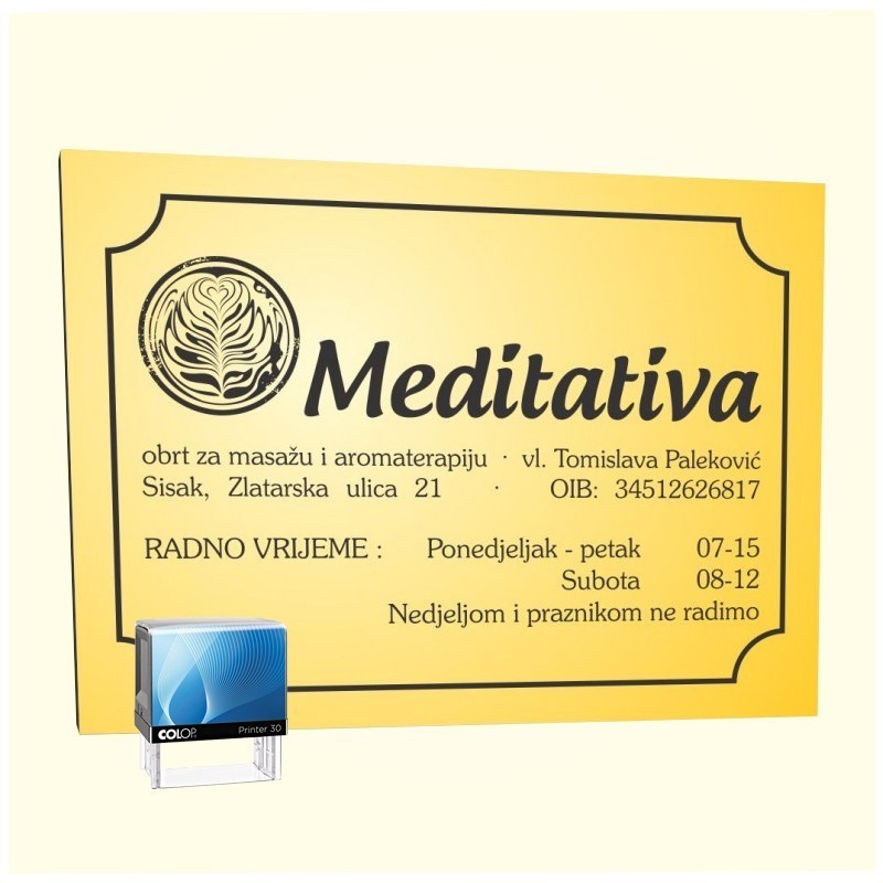 Prilikom otvaranja tvrtke, obrta, udruge i sl. obavezan je pečat i javno izložen natpis. Stoga smo osmislili i ovaj paket u kojem smo ponudili oboje za povoljniju cijenu.