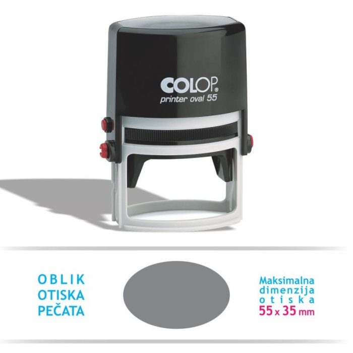 Automatski pečat Colop  Printer Oval 55 spada u skupinu ovalnih pečata čiji dizajn privlači pažnju. Otisak generira ovalni oblik sa maksimalno 6 reda teksta. Može poslužiti za kratke oznake, simbole i skraćenice. Omogućava precizan otisak jer ima okvir za pozicioniranje prilikom otiskivanja.