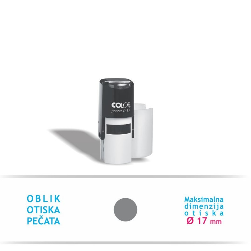 Pečat Colop Printer R 17 je okrugli pečat, idealni za kontrolne, testne ili inicijalne otiske. Namijenjen za centrirane logotipove i kratke oznake, simbole i skraćenice.