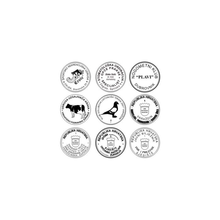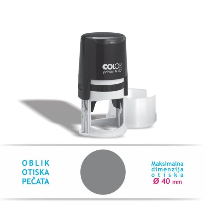 Pečat Colop Printer R 40 je okrugli pečat, idealni za centrirane logotipove, oznake, simbole, skraćenice i popratne tekstove unutar okvira otiska. Često korišten u službene svrhe.