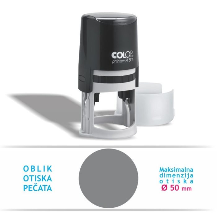 Pečat Colop Printer R 50 je najveći u skupini okruglih pečata, idealni za centrirane logotipove, oznake, simbole i popratne tekstove unutar okvira otiska. Često korišten u službene svrhe.