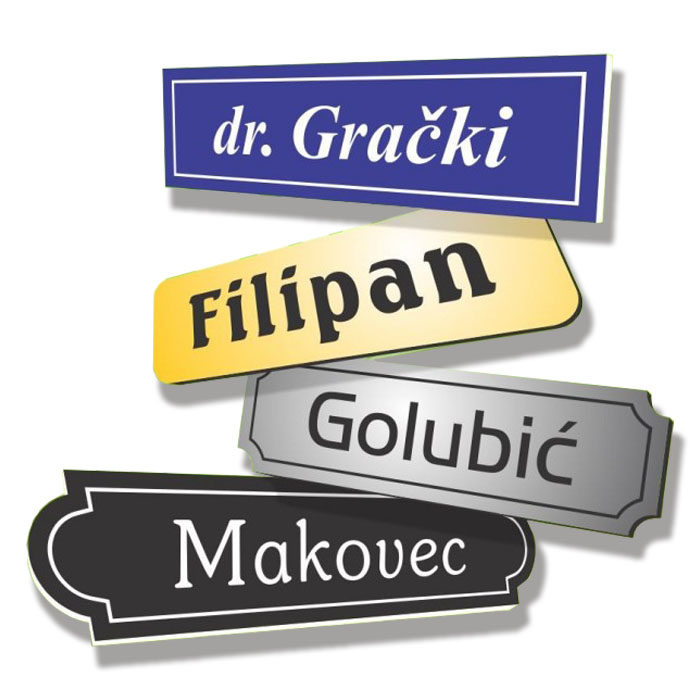 Pločica za poštanski sandučić s Vašim prezimenom maksimalnih dimenzija 50 x 15 mm. Mogućnost odabira između 7 različitih oblika pločice.