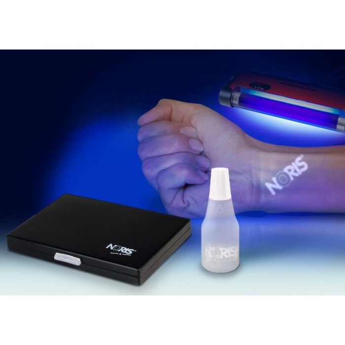 Visokokvalitetna UV Noris tinta za jastučić pečata – 25ml. Nevidljiva pod normalnim svjetlom ali žućkasta pod UV svjetlom (valna duljina oko 370nm).